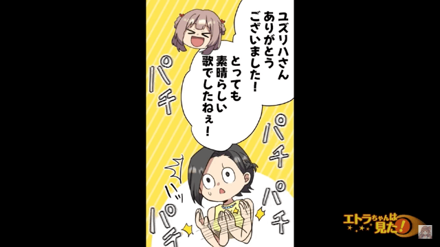 いとこの妻は手紙の代わりに、両親に素敵な歌を贈りました。 そしていとこの妻の歌に感動していた主人公は、なぜかいとこの妻の友人たちが顔面蒼白になっていることに気づいたのです。