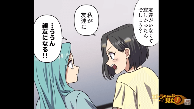 いとこの妻が両親の事故で胸がすく思いだと話す中、主人公はいとこの妻の笑顔を思い出していました。 そして主人公はいとこの妻に「私が友達に…ううん」「親友になる!」と宣言したのです。