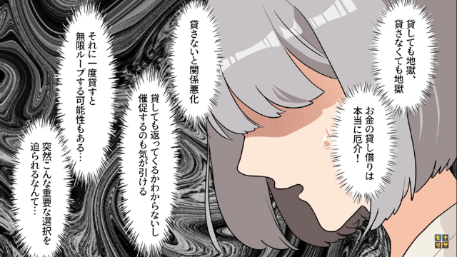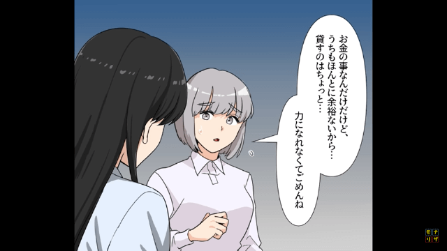 主人公はお金の貸し借りが厄介で、断っても関係が悪化する恐れがあることや、貸してもお金が返ってこない可能性があることをわかっていました。 そして主人公は少し考えた後で「うちもほんとに余裕ないから…貸すのはちょっと…」と言って断ったのです。