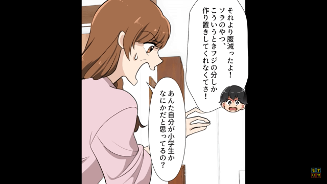 主人公に呼ばれて家に来た義母は、夫がまるで育児をしていないのだと知って怒り出しました。 さらに夫が息子の分の食事しか作り置きしていない主人公の悪口を言うと、義母は「あんた自分が小学生かなにかだと思ってるの?」と呆れたように言って…。