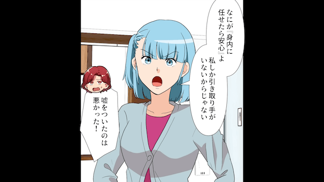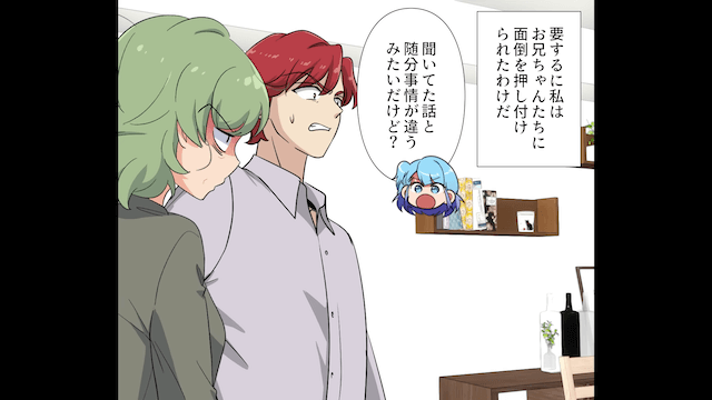 主人公が身勝手なことを繰り返す兄嫁を責めると、兄嫁は「ここも駄目だったら困るの!」と言い始め、主人公は兄嫁が今まで何度もクビになってきたことを知ります。 面倒ごとを押しつけられたことに気づいた主人公は母と兄を責めますが、兄に「クビにしないでやってくれ!」と必死に頼まれ、主人公は「裏切ったら即終わりだからね」と告げて兄嫁をクビにしないことに決めたのでした。