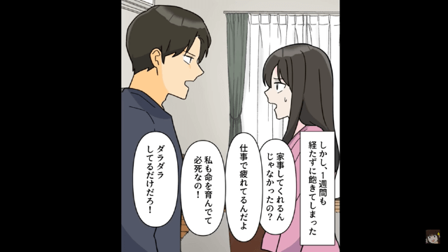 今回は『夫「彼女が妊娠したから離婚で(笑)」私「わかった」→お望み通り出ていった結果』を紹介します。 夫は妊娠中の主人公に理解を示さず、主人公がつわりで家事ができないことに対して不機嫌な態度を取ってきました。 しかし義両親は主人公の味方をしつつも、将来夫に介護を頼むつもりでいたため、あまり強く夫に言い返すことができなかったのです。