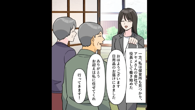 夫と浮気相手は養育費の支払いや義父への返金のため借金を負ったうえ、会社で浮気がバレて退職することに。 そして主人公は今でも義妹や義両親といい関係を築きながら、育児も仕事もこなして順調な日々を送るのでした。