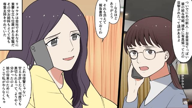 夫は優秀な主人公に劣等感を抱いていたと言い訳をし、主人公は夫の会社の株主として容赦なく夫を追い詰めると決意しました。 そして友人の手を借りて夫の浮気の決定的な証拠を集め、次の役員会に向けて準備を始めたのです。