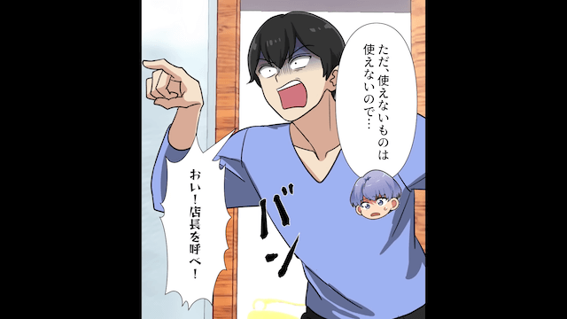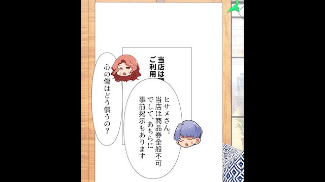 女性が「お店側が配慮するのは当たり前でしょう」と責めてくるため、主人公は商品券が使えないことを改めて説明し…。