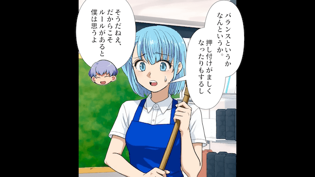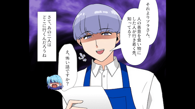 そして数日後、すべてが解決し、主人公はスタッフと人の善意について話し合うのでした。