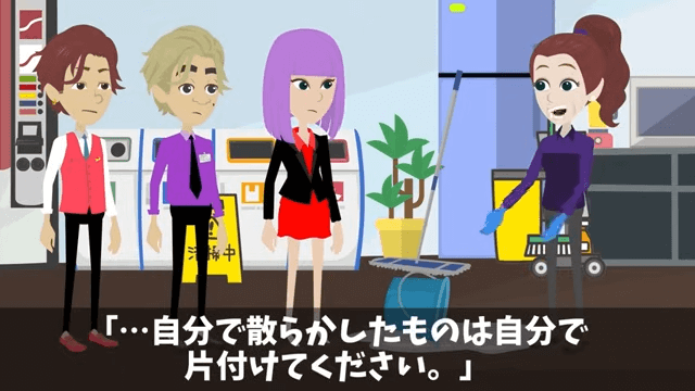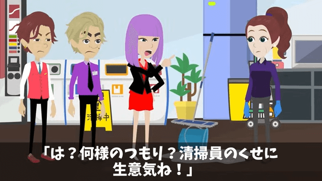 主人公はバケツを蹴飛ばした社長令嬢に「…自分で散らかしたものは自分で片づけてください」と伝えました。 すると社長令嬢は「は?何様のつもり?清掃員のくせに生意気ね!」と怒り出して…。