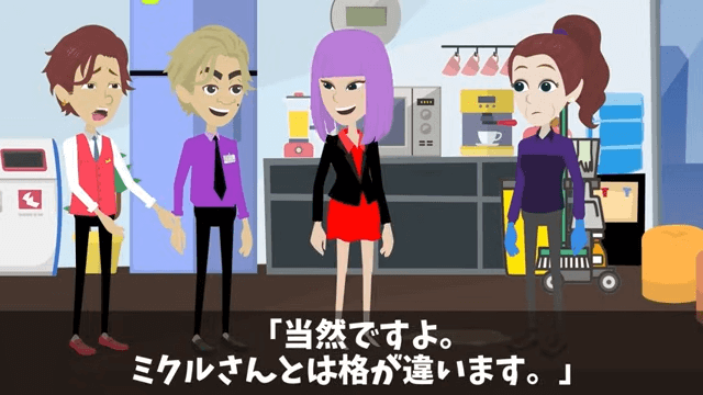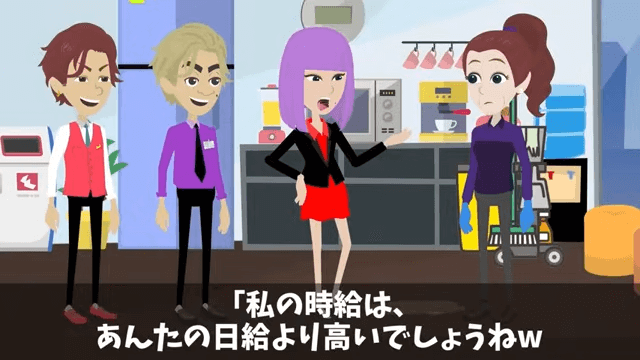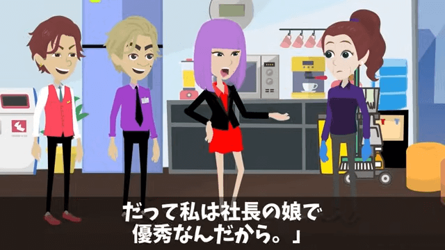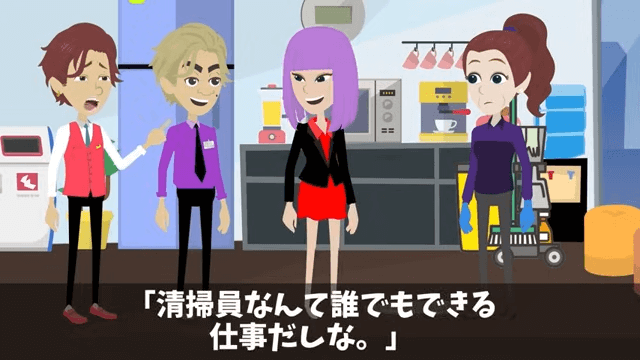 社長令嬢は「私の時給は、あんたの日給より高いでしょうね。だって私は社長の娘で優秀なんだから」と言いました。 そして取り巻きの男性も「清掃員なんて誰でもできる仕事だしな」と主人公を馬鹿にし始めて…。