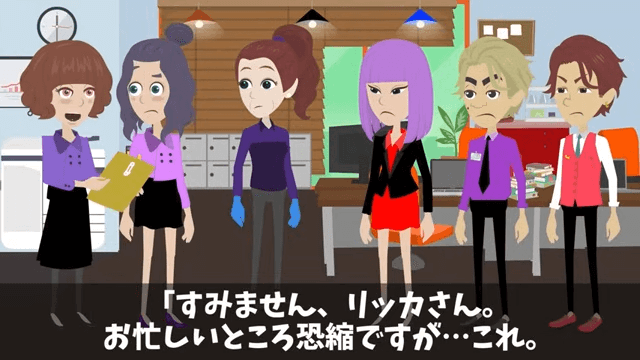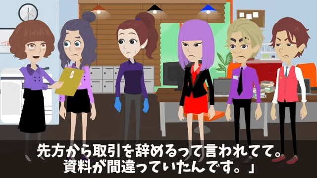 このままでは本当にまずいと思った女性社員は、主人公に資料を手渡して事情を説明します。 すると、それを見た社長令嬢が「何勝手に相談するって決めてるのよ!」と怒りました。