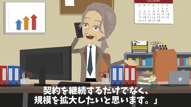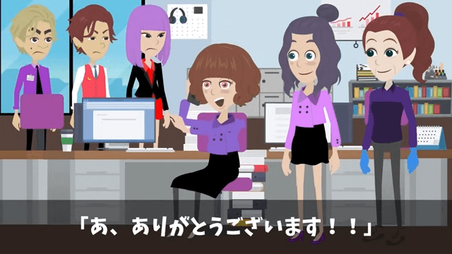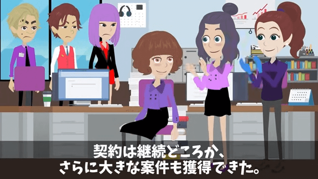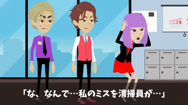 主人公のおかげで契約が継続されたどころか、さらに大きな案件も獲得できました。 その様子を見た社長令嬢は「な、なんで…私のミスを清掃員が…」と頭を抱えます。