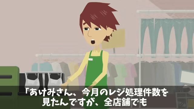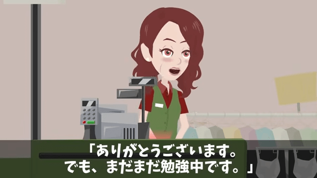 店長は主人公に「今月のレジ処理件数を見たんですが、全店舗でもトップクラスですね」と感心します。 それに対し主人公は「ありがとうございます。でも、まだまだ勉強中です」と答えました。