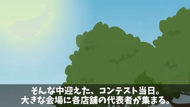先輩がサボる一方で、後輩は必死に客の対応に明け暮れていました。 そんな中でコンテスト当日を迎え、大きな会場に各店舗の代表者が集まります。