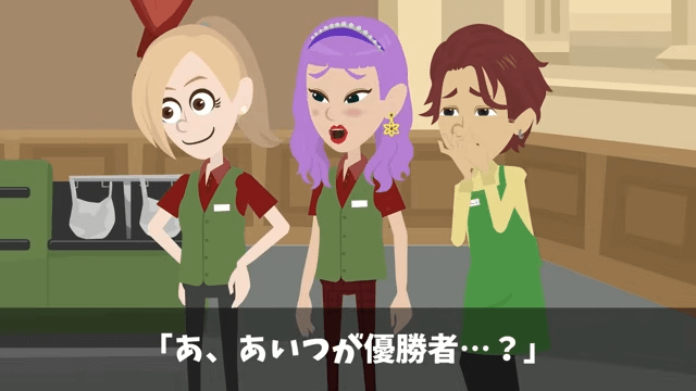 コンテストには先輩と後輩が参加し、新店長も応援に駆けつけていました。 そして審査員として主人公が紹介されると、新店長と先輩は動揺します。