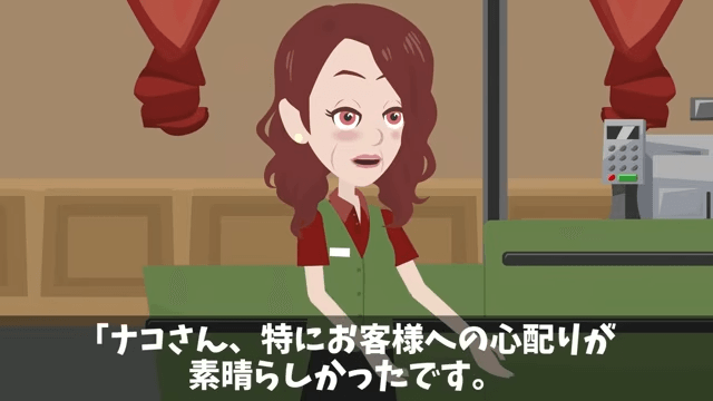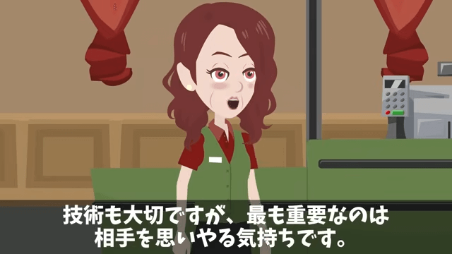 コンテストの結果、先輩は最下位で、後輩は3位でした。 審査員の主人公は「とくにお客様への心配りが素晴らしかったです」と後輩を評価します。