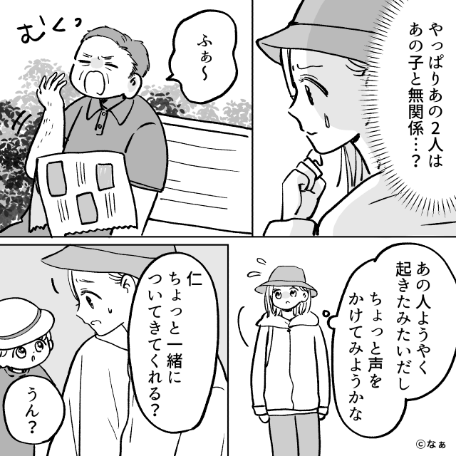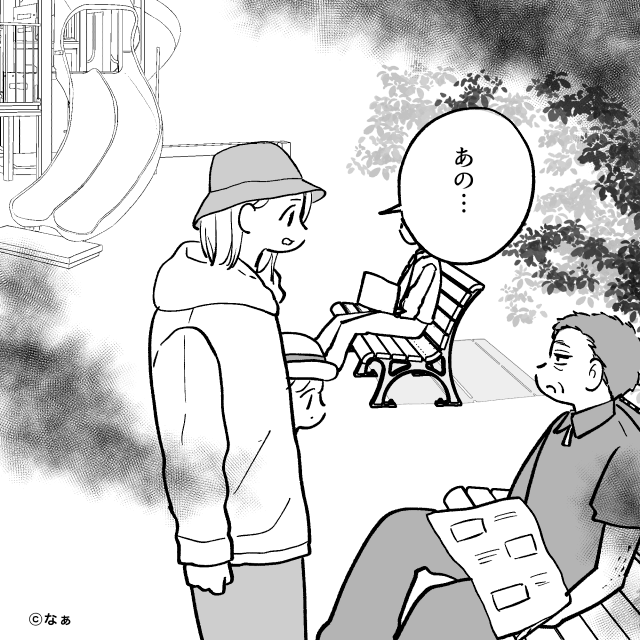 幼い子どもの近くには保護者らしき人がおらず、ベンチを利用している男性2人のどちらかが保護者の可能性があると考えた主人公。 しかし2人とも子どものことを一切見ておらず、不安になった主人公は遠目から子どもを見守ります。