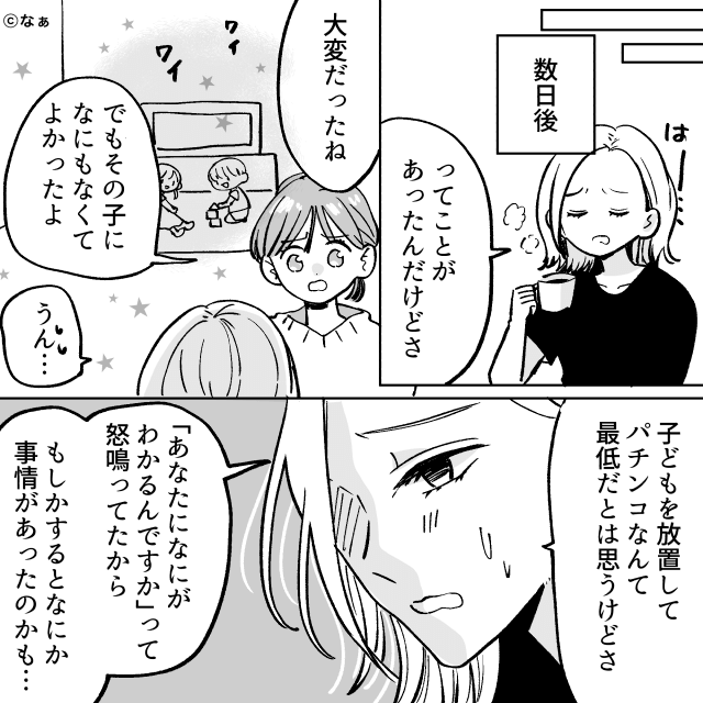 「あなたになにがわかるんですか!?」と言い返してきた父親は、警察を呼んで大事にした主人公を責めてきました。 それから数日後、友人に父親の件を報告し「私がしたことって正解だったのかな…?」とふとつぶやいた主人公。