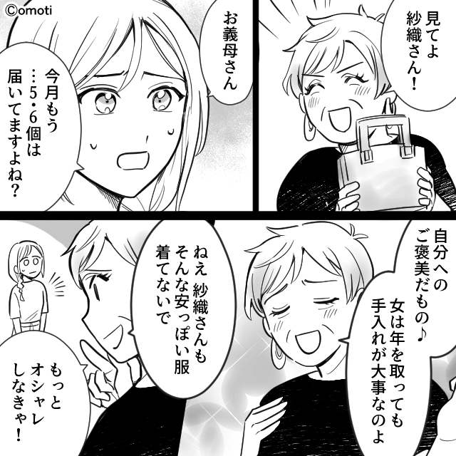 義母は恥ずかしい思いをしたため機嫌が悪く、主人公はうんざり。 しかし帰宅すると義母が注文した商品が届いていて、義母の機嫌は一気に治ります。