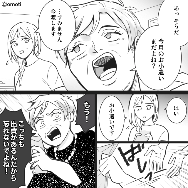 義母は「こっちにも出費があるんだから忘れないでよね!」と、感謝の言葉もなく主人公から封筒を奪い取ったのでした。