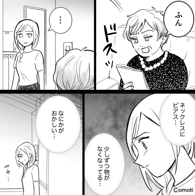 調べてみると、ピアスもなくなっていて「絶対おかしい…!」と確信した主人公。 その夜、義母にお小遣いをねだられたため、主人公は封筒を渡そうとするのですが…。
