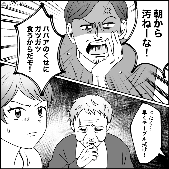 義両親の介護をしている主人公が、食事を用意したときのこと。 義母がむせて吐き出してしまうと、夫は激怒して義母を責めます。