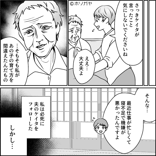 その後、主人公が「気にしないでくださいね」と義母を励ますと、義母は「そもそも私があの子の育て方を間違えたんだもの」と落ち込みながら言ったのでした。