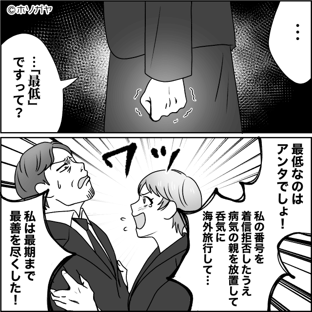 今回は『介護を押しつけて海外旅行をした夫の話』を紹介します。 夫は主人公に義父の介護を押し付けて海外旅行に出かけました。 夫が旅行費用として貯金を使い込んでいたことが判明し、絶望する主人公。 そんなとき、義父から「大事な話があるんだ…」と言われ…。 1ヶ月後、義両親が続けて亡くなってしまい、夫は慌てて帰国。 そして夫は「お前に任せたのにこんな結果にしやがって!」と主人公を責めました。 主人公が「私は最期まで最善を尽くした!」と言い返すも怒りが収まらない夫は、離婚を突きつけてきて…。