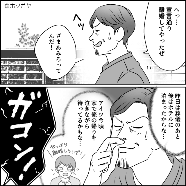 主人公が離婚を選択すると、途端に焦り始めて引きとめてくる夫。 しかし主人公は「もうあんたと暮らすなんてまっぴらごめんよ」と告げ、離婚届を提出します。