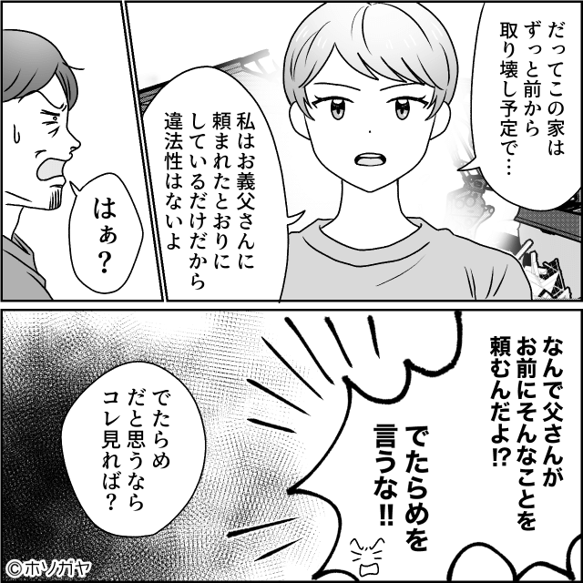 帰宅すると家が解体されていて、夫は呆然。 近くに立っていた主人公を責めますが、主人公に「私はお義父さんに頼まれたとおりにしているだけだから」と言われてしまいます。