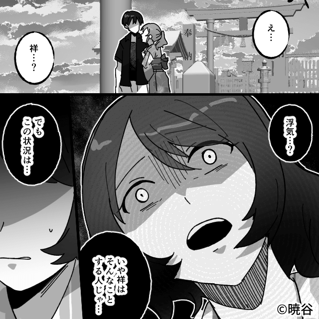 祭り当日、待ち合わせ場所になぜか先輩が現れ、困惑する彼氏。 実は先輩は待ち合わせの時間と場所を、主人公から無理やり聞き出していたのです。