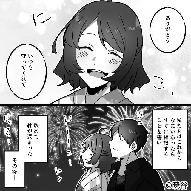 これからはお互いにすぐ相談することを誓い、改めて彼氏との絆が深まったと感じる主人公なのでした。
