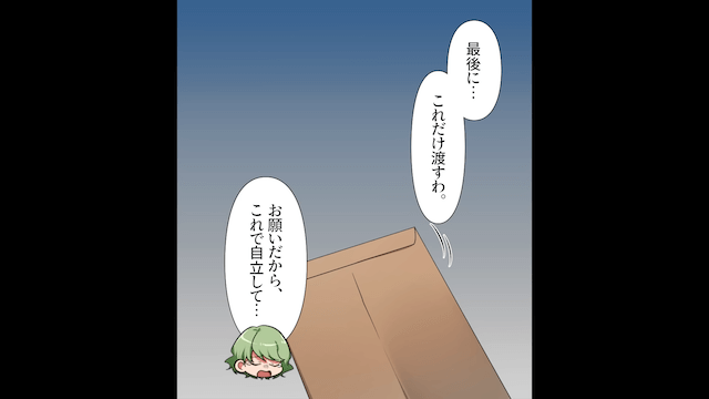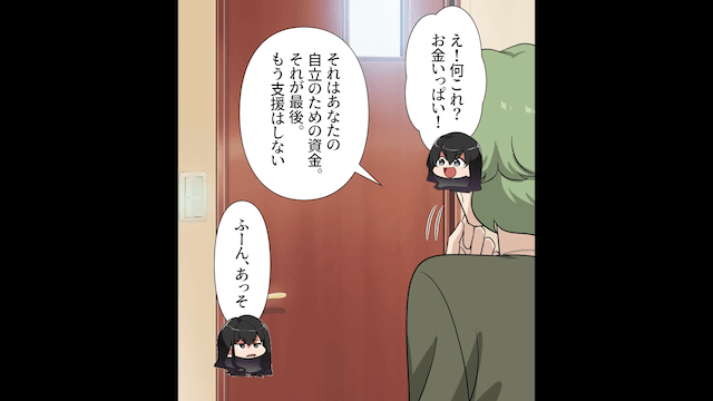 「それが最後」と自立のための資金を渡すのですが、真剣に話を聞いていない主人公はそのお金さえも課金に使おうとするのでした。