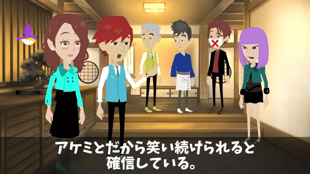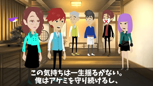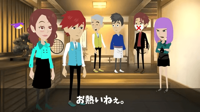 主人公は、妻が自分にとって唯一無二の存在で、この気持ちは一生揺るがないと言います。 それを聞いた妻は照れ、社長は「お熱いねぇ」と言いました。