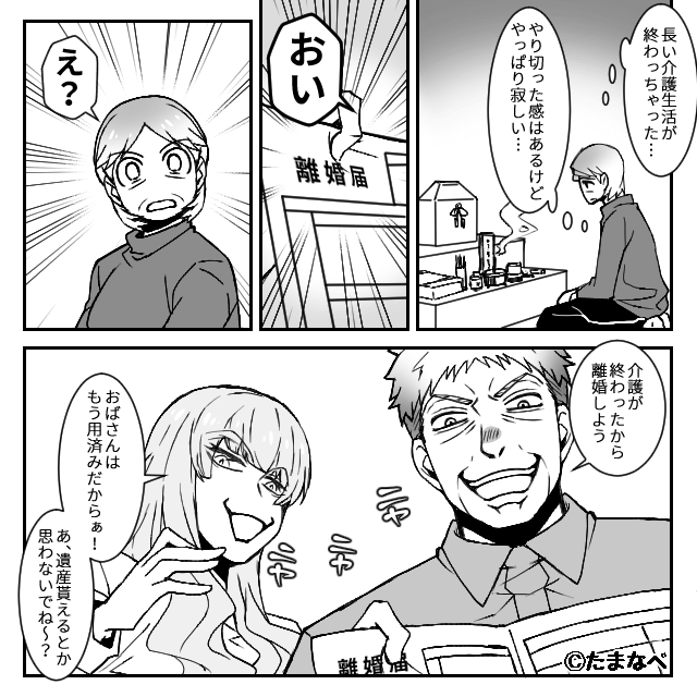 義母に「手伝いすらしないで家にいるだけなら出てけ!」と激怒され、必死に謝罪をした夫と娘。 しかし数ヶ月後に義母が亡くなると、2人は「介護が終わったから離婚しよう」とニヤニヤしながら離婚を突きつけてきました。