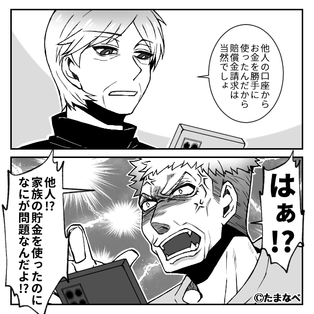 主人公が夫と娘に500万円の賠償金請求をすると、夫は激怒して電話をかけてきました。 怒鳴る夫に、主人公は「他人の口座からお金を勝手に使ったんだから賠償金請求は当然でしょ」と告げます。