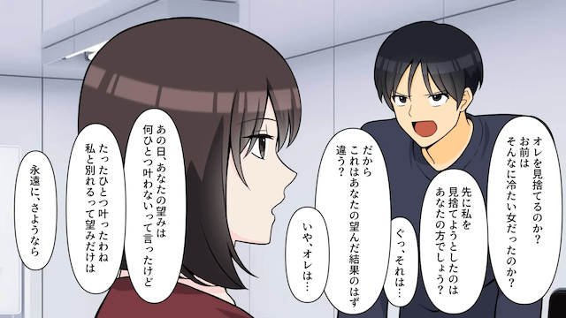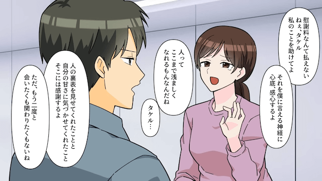 自分が悪いと思っておらず責任転嫁を続ける夫と部下に、主人公は慰謝料を請求。 支払いができない部下は婚約者にすがり、夫は主人公に助けを求めてきます。