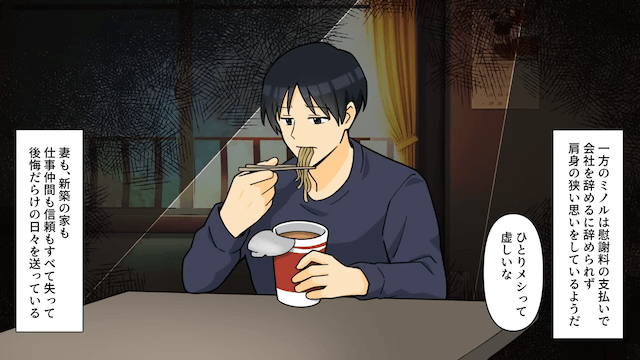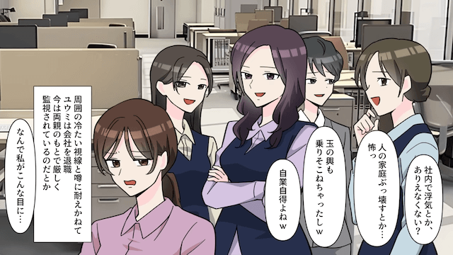 しかし主人公が許すはずもなく、部下は会社で噂をされ、夫はすべてを失ったのでした。