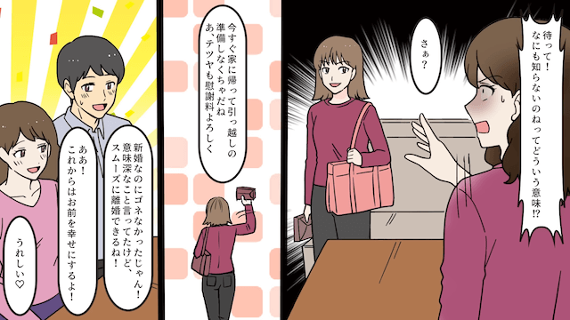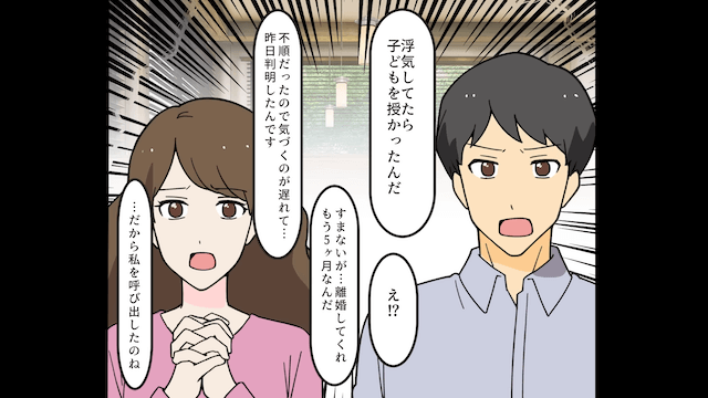 夫が帰ってこなかった日の翌日、夫にカフェに呼び出された主人公。 カフェには夫の幼なじみもいて、夫が幼なじみと浮気していたことや、子どもができたことを知らされました。