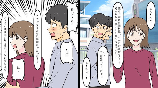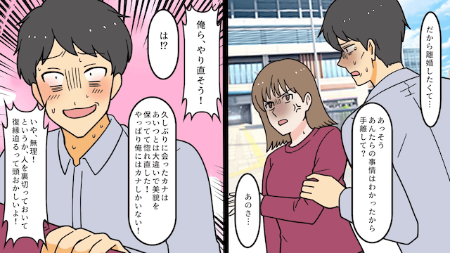 元夫が家を出ることについて文句を言ってきた幼なじみに対し、主人公は自分が独身時代に購入した家であることを説明し、幼なじみを追い返しました。 それから1年後、主人公は疲弊した元夫と偶然再会し、元夫は主人公に復縁を求めてきて…。