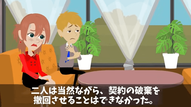 呆れた主人公は「コントならよそでやってください。それじゃ」と言って立ち去ります。 こうして2人は、契約破棄を撤回することはできませんでした。