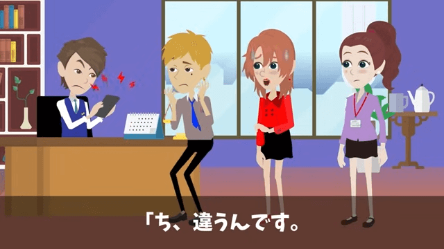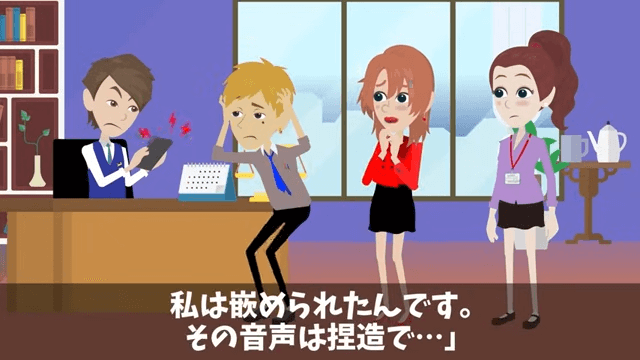 録音を確認した社長は「…これは…どういうことかな?」と2人に尋ねます。 すると係長は「ち、違うんです。私ははめられたんです。その音声は捏造で…」と言い始めました。