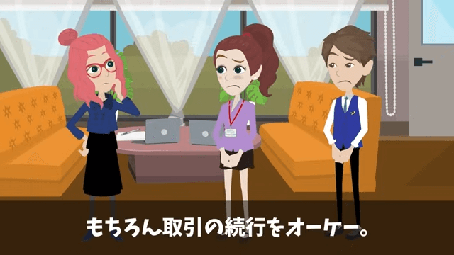 部長と係長が異動になったことを知り、主人公は取引の続行を認めました。 プロジェクトが正式に始まった一方で、支社の窓際部署に飛ばされてしまった2人は…。