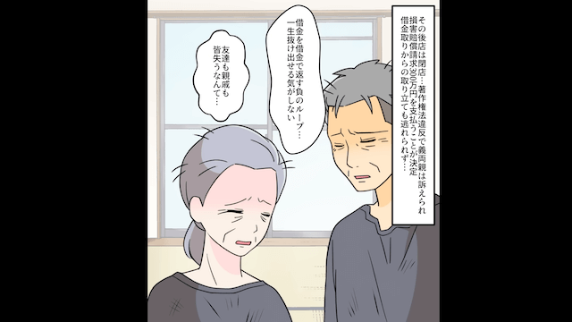 主人公が仕事や資産運用で成功したことを知り「私たちだってできるわ!」と前向きになる義両親。 しかしそこに借金取りがやってきて、義両親に返済を迫ります。