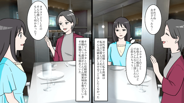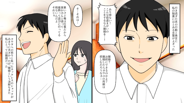 夫は飲み代のために主人公の大切なアクセサリーを売ったようで、激怒した主人公は離婚を考え始めます。