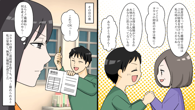 母にすべてを打ち明けて背中を押してもらった主人公は、すぐに夫に離婚を突きつけます。 夫は離婚を渋ったものの、義母に「財産分与として慰謝料も請求できる!」と言われて上機嫌で離婚に同意。