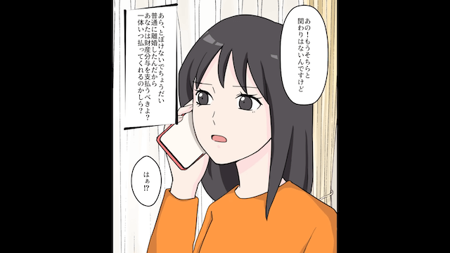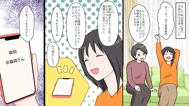 無事に離婚が成立して主人公は安心するのですが、後日、義母から「財産分与を支払うべきよ?」と連絡がきたのでした。