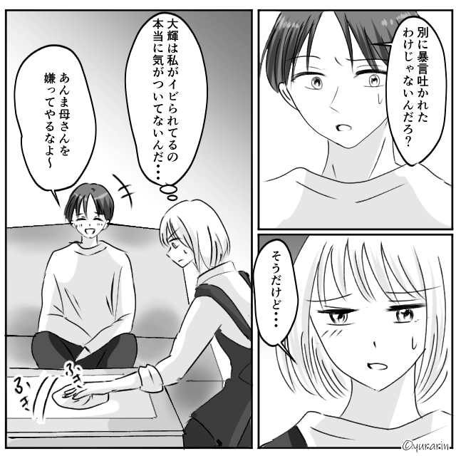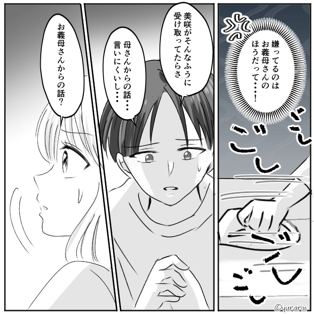 主人公が義母にイヤミを言われたことを夫に相談するも、夫は「でも悪気はないんじゃない?」と義母の肩を持ちます。 そんな夫に主人公が呆れていると、夫は「君がそんなふうに受け取ってたらさ、母さんの話…言いにくいし…」となにやら悲しそうな表情をして…。