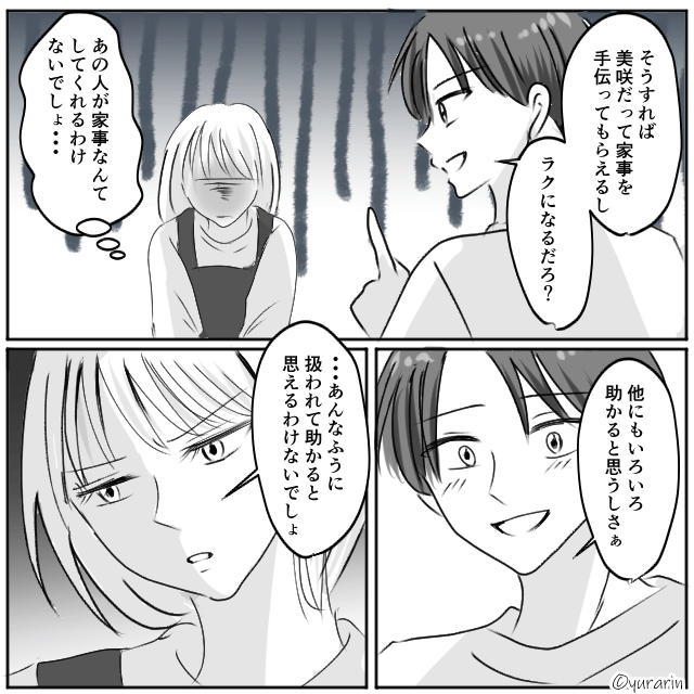 義母は同居を望んでいるようで「前から言われててさ」と話す夫。 夫は同居をすれば主人公の家事が楽になると思っているようで、前向きに考えているようでした。