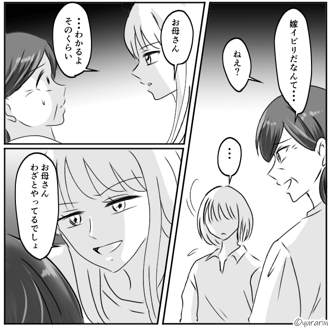 誕生日会に義姉がやってきたため、義姉の前で「お義母さんケーキの代わりにおせんべいありがとうございます」と言った主人公。 すると主人公が嫁いびりを受けていることを察した義姉は、義母を責めます。