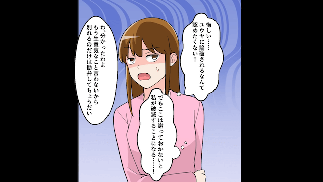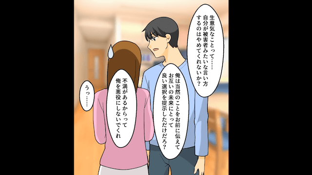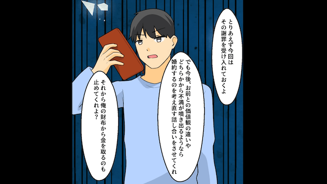 低収入ではないため、極端な浪費をしなければ2人で生きていけることを婚約者に伝えた主人公。 どうしても浪費をしたいのであれば別れる必要があると伝えると、婚約者は身を守るために渋々主人公に謝罪をします。