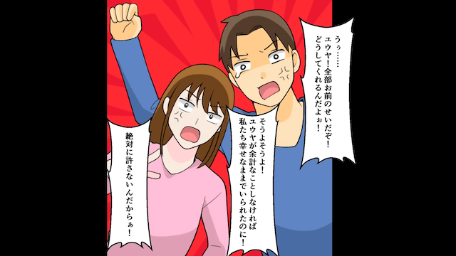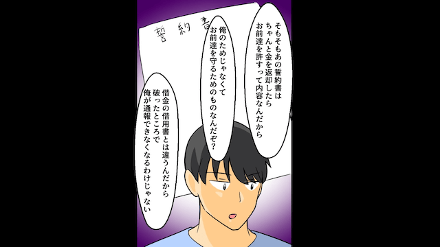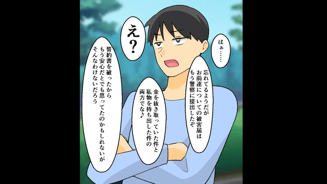 友人に愛想が尽きた妻は慰謝料を請求し、泣いてすがる友人を相手にしませんでした。 婚約者と友人は怒りの矛先を主人公に向けますが、主人公はすでに被害届を提出済みだと告げ、誓約書を捨てても意味がないことを2人に伝えます。